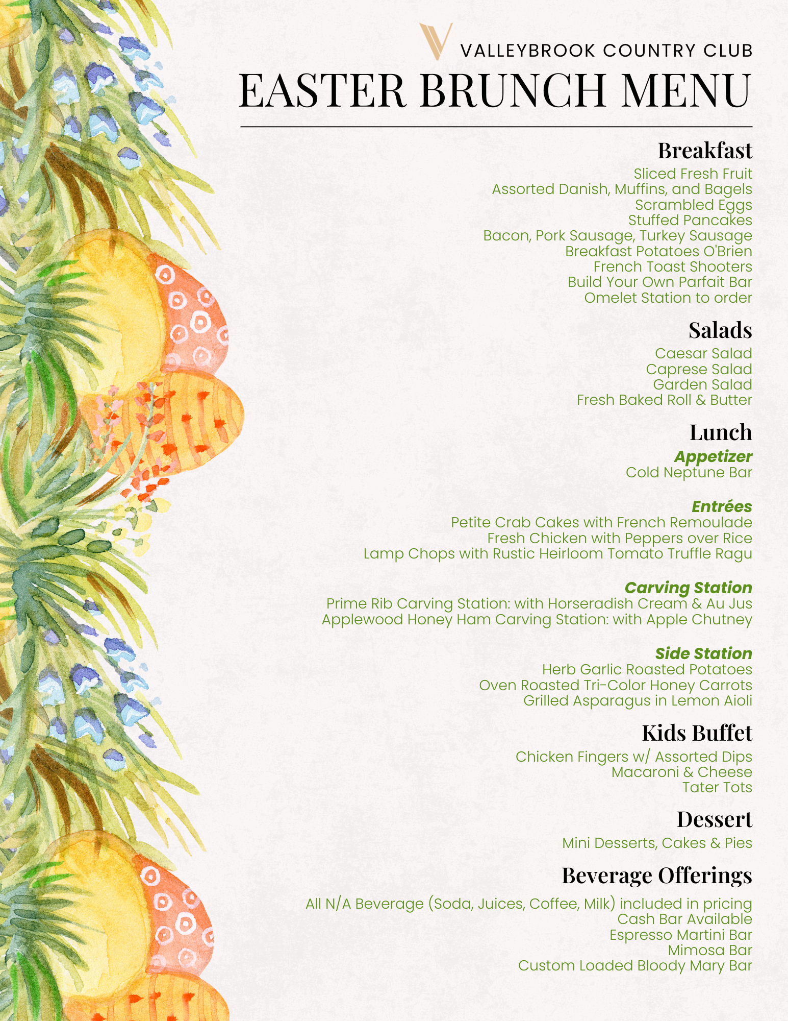 Valleybrook’s Easter Brunch is officially sold out. We thank you for your patrionage and look forward to serving you.
