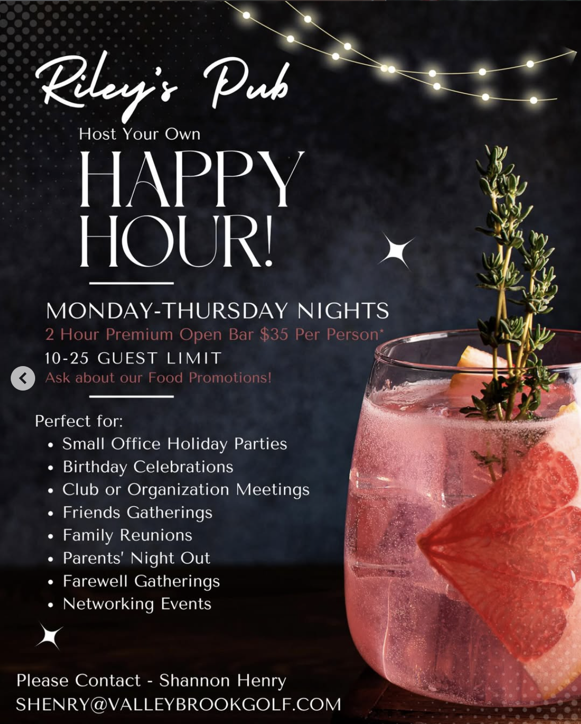 Looking for the perfect spot to gather, celebrate, or unwind? Riley’s Pub at Valleybrook offers a customizable Host-Your-Own Happy Hour experience, available Monday–Thursday nights. Enjoy a 2-hour premium open bar for $35 per person, with space for 10–25 guests, making it ideal for both intimate and lively get-togethers.